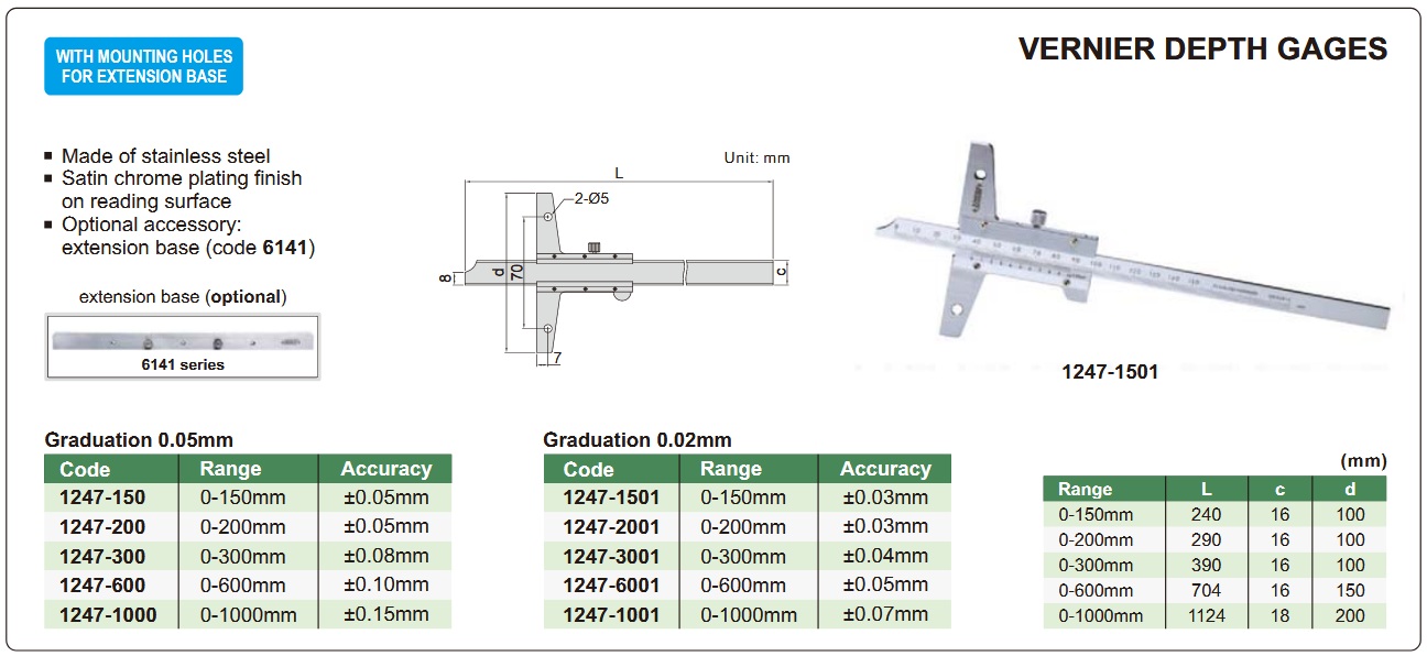 Deskripsi Produk Vernier Depth Gage (Base Length 150mm) 0-600mm Insize 1247-6001